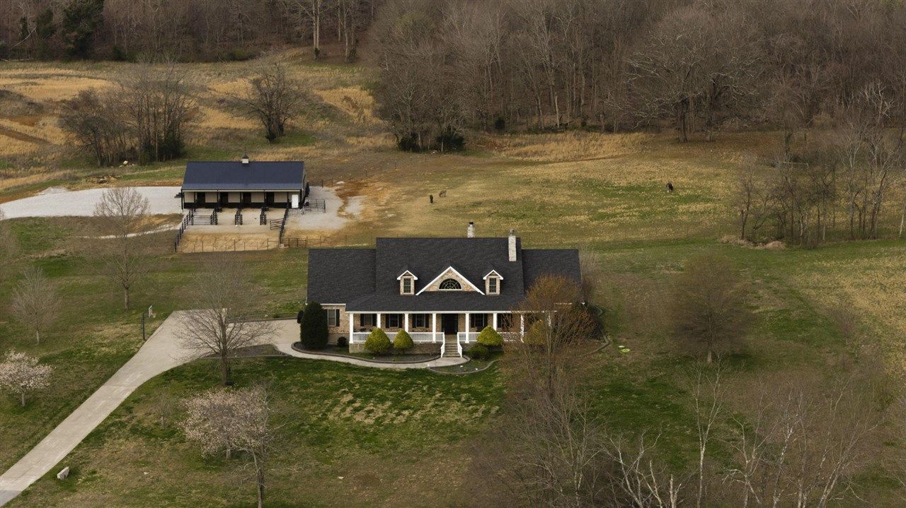 Situated on approximately 73 acres at 1185 Jack Smith Road, this custom-built home offers privacy, natural beauty, and spacious living just minutes from town. Built by Doug Martins, the property is surrounded by mature woods and borders approximately 400 acres of undeveloped private land, creating a peaceful and secluded setting with abundant wildlife. A 48x60 custom built barn with 4 12x12 Preifert stalls, in addition to the office space there is feed and tack rooms. Theres also a 15x60 storage room for machinery. The land features a freshwater spring, pond, and gently rolling terrain. The property was previously divided into five separate tracts, offering potential flexibility for future use. The home offers over 5,000 square feet of living space with Brazilian cherry hardwood flooring, ceilings over 10 feet, and detailed trim work throughout. A two-story foyer with a wrap-around staircase leads into the main living area featuring vaulted ceilings, a stone fireplace, and wet bar. The kitchen includes custom cabinetry, ample storage, a walk-in pantry, and an adjacent full bath that also serves as a storm shelter. Additional features include a security system and surround sound intercom. The primary suite includes heated tile floors, a whirlpool tub, a large walk-in closet with custom shelving, and a private screened porch. The upper level includes four additional bedrooms, including one with a private bath and two connected by a Jack-and-Jill bathroom, along with a media area and bonus room with a secondary staircase to the kitchen. Additional improvements include an attached two-car garage and a detached four-car workshop. The property is serviced by NCTC fiber internet. Conveniently located near Bowling Green amenities including shopping, dining, Western Kentucky University, the National Corvette Museum, and the regional airport. Nashville, TN is approximately one hour away.